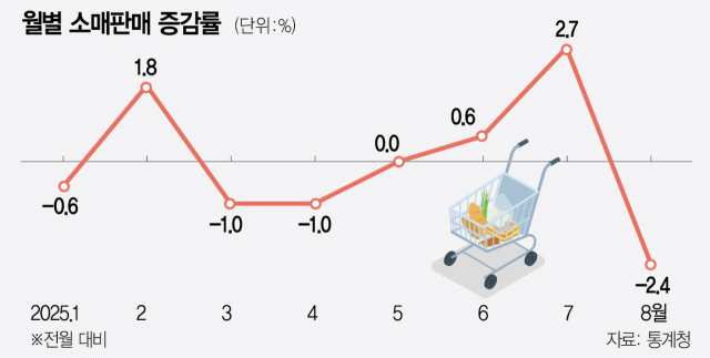 통계청이 30일 발표한 ‘8월 산업활동동향’에 따르면 8월 소매판매액지수는 102.2(계절조정계열·2020년=100)로 전월 대비 2.4% 감소했다. 이재명 정부 출범 이후 이어진 6월(0.6%), 7월(2.7%) 2개월 연속 소비 증가세가 멈춘 것이다. 8월 소매판매 감소 폭은 지난해 2월(-3.5%) 이후 18개월 만에 가장 컸다.
