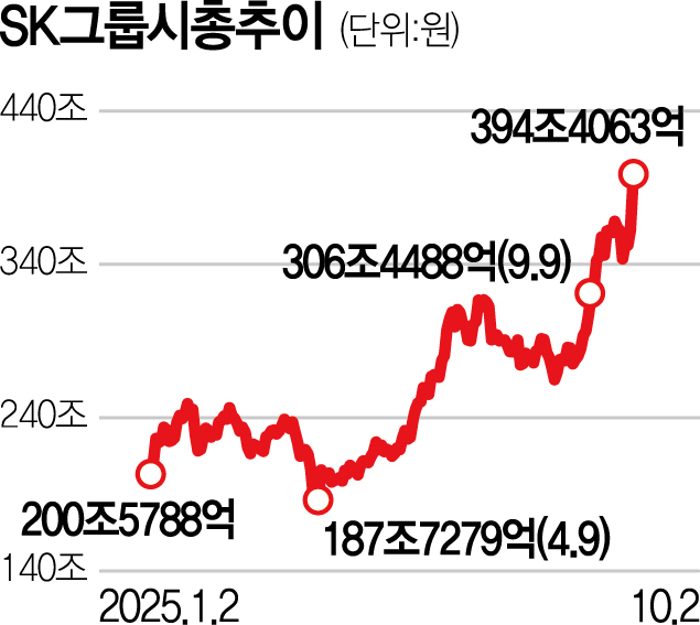 2일 한국거래소에 따르면 이날 국내 상장된 SK그룹 계열사 25개(우선주 포함)의 합산 시가총액은 394조 4063억 원으로 집계됐다. 올 1월 2일 200조 5788억 원에서 9개월 만에 두 배 가까이 커진 것이다. 올 6월 처음으로 300조 원 돌파에 성공했던 SK그룹 시총은 잠시 조정 국면에 진입했다가 지난달 9일 300조 원을 재돌파했다. 이후 한 달도 지나지 않아 시총이 100조 원 가까이 불어났다.
