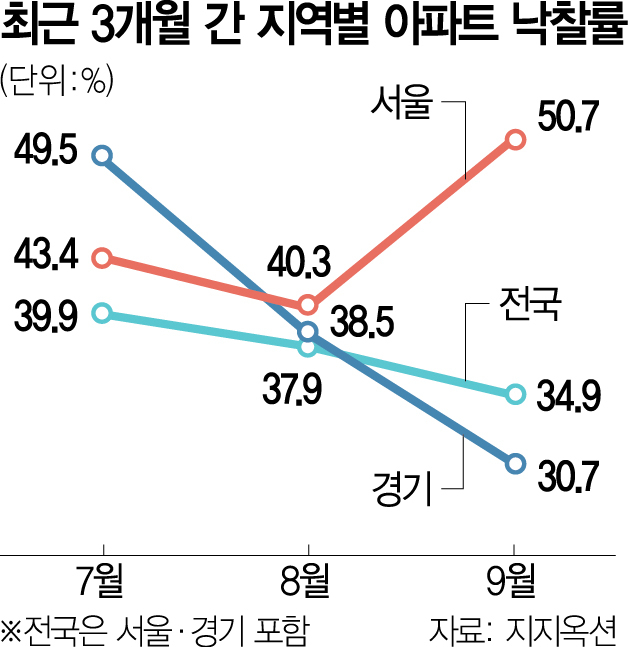 서울 아파트값이 오름세를 타며 경매 시장의 낙찰률과 낙찰가율이 모두 3년 여 만에 최고치를 기록했다. 반면 서울을 제외한 수도권과 지방 아파트에서는 두 지수가 하락하는 등 경매시장에서도 서울과 비(非)서울 아파트 가격이 양극화되고 있다.