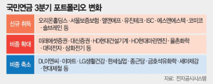 2일 금융감독원 전자공시시스템에 따르면 국민연금공단이 3분기(7~9월) 중 지분 5% 이상을 신규 취득해 공시 의무가 발생한 상장사 18개사 가운데 소부장 관련 기업만 8개사로 나타났다. 코미코(지분율·5.2%), ISC(5.15%), AP시스템(5.09%), 에스앤에스텍(5.02%), 솔브레인(5.02%), 유진테크(5.01%) 등 반도체 관련 코스닥 상장사와 비에이치(7.30%), 엘앤에프(5.06%) 등 유가증권시장 상장사도 일부 담았다. 올해 상장한 서울보증보험(6.20%)과 달바글로벌(6.19%)도 투자를 개시했다.