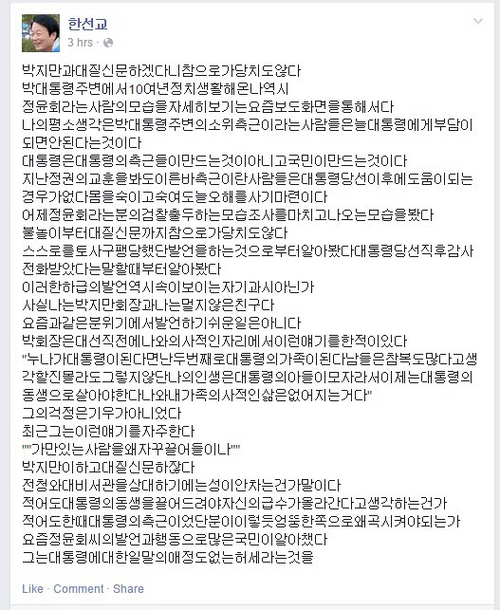 한선교 새누리당 의원은 박근혜 대통령의 동생 박지만 EG 회장의 정윤회 씨의 복잡한 심경을 페이스북에 소개했다.