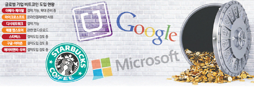 글로벌 기업들이 세계 최대 가상화폐인 비트코인을 속속 결제수단으로 도입하고 있다. 페이팔과 델 등에 이어 마이크로소프트(MS)가 비트코인의 온라인 결제를 선언했다. 여기에 스타벅스·구글·아마존·에어비앤비·우버 등도 도입을 검토 중에 있어 내년과 내후년에 비트코인 결제가 크게 확산될 것으로 전망된다. 전문가들은 모바일결제 경쟁에서 한발 뒤진 한국이 비트코인을 통해 역전이 가능하다고 분석한다.