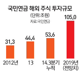 국민연금이 국내 시장 집중 투자에 따른 위험을 낮추기 위해 오는 2019년까지 해외 주식에 100조원이 넘는 돈을 투자한다.