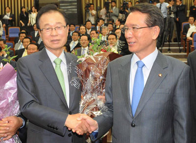 | | 18대 국회 후반기 국회의장으로 내정된 박희태(왼쪽) 한나라당 의원이 7일 오전 서울 여의도 국회에서 열린 한나라당 의원총회에 참석해 전반기 임기를 마친 김형오 전 국회의장과 악수하고 있다. /오대근기자 |