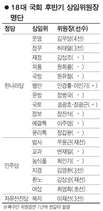 새 국회 상임위원장은 한나라당의 경우 김무성 원내대표가 운영위원장을 맡고 ▦정무 허태열 ▦기획재정 김성조 ▦국방 원유철 ▦문화체육관광방송통신 정병국 ▦정보 정진석 의원으로 결정됐다.