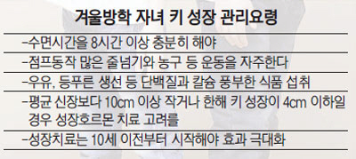 초등학교 1학년 자녀를 둔 주부 김정숙(37·가명)씨는 곧 다가올 겨울방학 때 자녀에게 성장호르몬 치료를 받게 해야 할지 고민이다. 키를 재봤더니 연초에 비해 2㎝ 정도밖에 자라지 않았고 또래보다 작아 보이는 자녀를 볼 때마다 학교생활에 적응을 못할까 봐 걱정이 이만저만이 아니다.