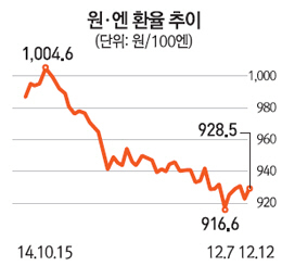 이에 따라 원·엔 환율은 하락 압력을 받을 것으로 전망된다. 지난달부터 외환 당국이 원화와 엔화 가치를 동조화해서 움직이도록 하는 가운데 최근 들어 원화 하락세가 엔화를 못 따라가 원·엔 환율은 100엔당 920원대로 내려앉았다. 12일 오후3시 현재 928원7전(외환은행 고시 기준)에 거래돼 전 거래일보다 3원8전 하락했다. 지난 9일 기준으로는 한 달 동안 원화는 달러 대비 약 2.9% 하락했지만 엔화 가치는 5.9% 떨어지며 엔화가 원화보다 2배 빠른 하락세를 보이고 있다.