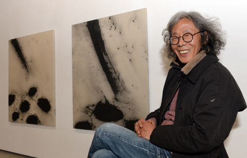 한국화의 호방한 멋을 이야기하며 '일필휘지로 휘갈긴 힘찬 붓질'을 운운하고는 한다. 이런 필치가 쉬워 보일지도 모른다. 하지만 이는 결코 쉽게 따라 할 수 없는, 아니 범접하기 어려운 경지에서나 가능하다. 서울 평창동 김종영미술관에서 열린 한국화가 김호득(64·사진)의 대규모 개인전이 그렇다. 젊은 여자의 허벅지 굵기만 한 검은 먹선이 힘차게 화폭을 가른다. 기교 따위는 필요도 없어 보인다. 그러나 아무나 그릴 그림은 아니었다. 그는 엄연히 '한국화가'지만 지필묵, 즉 화선지와 붓과 먹으로 대표되는 한국화의 전통 재료에 얽매이지 않는다. 그림을 고집하지도 않는다. 전시장 2층의 설치작 '그냥 문득'은 대형 수조에 먹물을 채우고 사각의 한지 기둥을 세운 작품이다. 바라보는 관람객의 얼굴이 비칠 정도로 새까만 먹물의 양(量)은 작가가 오늘의 경지에 도달하기까지 보낸 각고의 시간에 비례한다고 했다. 한국화의 고루하고 진부한 이미지를 깨고 파격적 현대미술로 승화시키는 작가, 김호득 영남대 교수를 만났다.