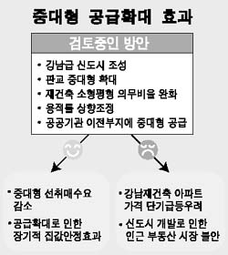 "중장기적 집값 안정 도움될것" [당정, 수도권 중대형 공급확대 결정] 시장 반응기존 수요억제 정책서 방향선회 긍정적재건축 규제완화 다시 시장 자극할수도 이혜진 기자 hasim@sed.co.kr 부동산 관련 대책 당정협의에서 부동산 시장 안정을 위해 중대형 아파트 공급확대 방안이 포함되면서 시장에 미칠 영향에 관심이 모아지고 있다. 정부의 이 같은 검토작업에 대해 부동산 전문가 및 시장 관계자들은 “장기적으로 시장안정에 도움이 될 것”이라면서도 “섣부른 재건축 규제완화 정책 시사는 다시 재건축 아파트 시장을 불안하게 할 수 있다”고 크게 우려했다. ◇공급확대, 중장기적 안정 효과=전문가들은 중대형 아파트의 공급을 늘리겠다는 당정의 정책방향 선회에 대해 긍정적으로 평가했다. 그동안 정부 및 여당 관계자들은 “집값이 오르는 이유는 투기적 수요 때문”이라며 세무조사, 담보대출비율 축소 등을 통해 수요 억제에만 초점을 맞춰 정책을 내놓았다. 고종완 RE멤버스 사장은 “그동안 중대형 아파트 공급이 줄어들 것에 대한 우려로 중대형 아파트 가격이 올랐다”며 “공급확대 방침으로 선회함으로써 시장의 이 같은 불안심리를 안정시킬 수 있을 것”이라고 내다봤다. 그러나 강남 대체 신도시를 본격적으로 개발하면 그 개발대상지를 중심으로 다시 부동산 가격이 상승할 수도 있다는 우려도 제기되고 있다. ◇강남 재건축 불안 야기=그러나 강남 재건축 규제 완화를 언급한 것은 다시 시장 불안을 야기시킬 수 있는 것으로 지적됐다. 현재 강남 재건축 아파트는 소형평형의무비율, 임대아파트 건립 등을 통해 개발이익환수 등 각종 규제를 통해 묶어놓았음에도 불구하고 그동안 지분 가격이 올랐다. 이 상황에서 섣불리 규제 완화를 언급한 것은 시장을 다시 자극할 가능성이 높다. 서초구 반포동 D공인중개사 관계자는 “최근 들어 오를 만큼 올랐다는 판단하에 매물이 하나둘씩 나왔는데 어제 발표로 다시 매물이 들어갈 가능성이 높다”고 말했다. 소형평형의무비율 축소, 용적률 상향 조정 등의 규제 완화와 함께 개발이익환수에 대한 조치도 반드시 패키지로 나와야 한다는 게 전문가들의 지적이다. 김영진 내집마련정보사 사장은 “그동안 집값 상승을 주도한 것은 분당과 강남 재건축 아파트였다”며 “재건축 규제 완화를 하는 만큼 개발이익환수도 강화하지 않으면 강남 집값은 다시 오를 것”이라고 경고했다. 입력시간 : 2005/07/07 16:25