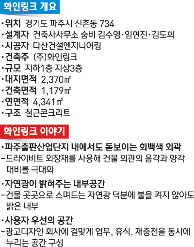 경기도 파주시의 파주출판산업단지. 출판단지 내에 들어서면 다양한 창의성을 요구하는 업무시설이 많은 곳인 만큼 개성 있는 건물들이 연이어 눈길을 끈다. 좁은 도로 양쪽으로 즐비한 건물 사이를 걷다 보면 회백색의 단아하고 각진 외관을 가진 건물이 시야에 들어온다. 파주출판산업단지 내에서도 가장 돋보이는 건물 중 하나인 '화인링크'가 그 주인공이다. 이 건물은 파주출판단지 내에서도 독특한 의미를 지닌 건물이다.
