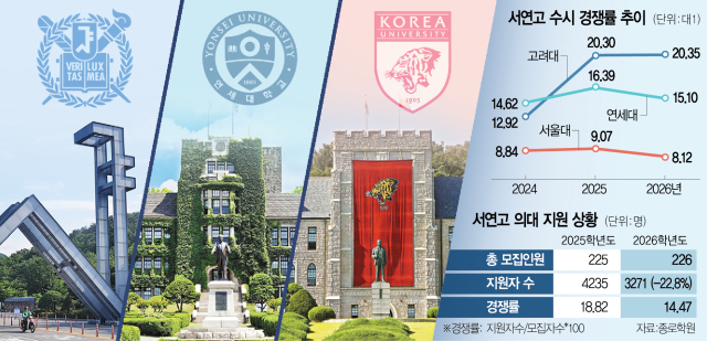 2026학년도 대학 수시모집 서류 지원이 지난 주 마무리된 가운데 서울대·고려대·연세대(SKY) 수시 경쟁률이 전년도보다 떨어지고 3개 대학 의대 지원자 수도 줄어든 것으로 나타났다. 역대급 ‘사탐런’ 현상, 의대 모집정원 축소 등 다양한 입시 변수로 인해 합불 예측 가능성이 떨어지며 최상위권 수험생 대부분이 하향 안정 지원을 한 것으로 풀이된다.