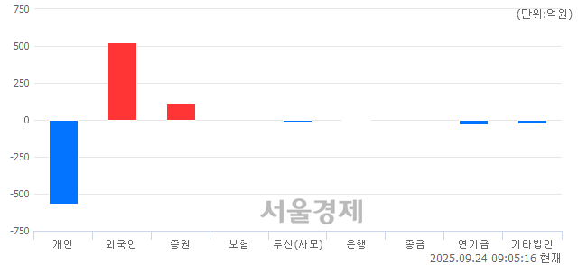 투자자별 동향을 살펴보면, 외국인과 기관이 '쌍끌이' 매수세로 상승장을 이끌고 있으며, 개인만 '팔자'에 힘을 실었다. 외국인은 350억, 기관은 43억을 순매수 중이며, 개인은 375억을 순매도하고 있다.