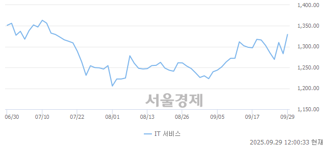 강세업종은 IT 서비스업(+3.74%), 증권업(+3.57%), 전기전자업(+1.92%)이며, 약세업종은 부동산업(-0.56%), 서비스업(-0.23%), 통신업(0.00%)이다. 수급측면으로는 전기전자업이 60:40의 매도우위세를 나타내고 있으며, 철강금속업은 25:75의 강한 매수우위세를 기록 중이다.