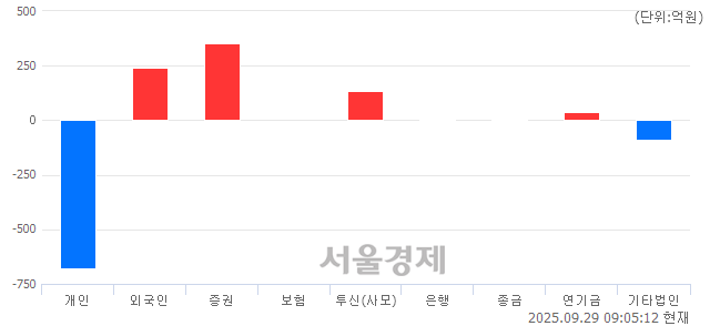 투자자별 동향을 살펴보면, 외국인과 기관이 '쌍끌이' 매수세로 상승장을 이끌고 있으며, 개인만 '팔자'에 힘을 실었다. 외국인은 464억, 기관은 547억을 순매수 중이며, 개인은 882억을 순매도하고 있다.