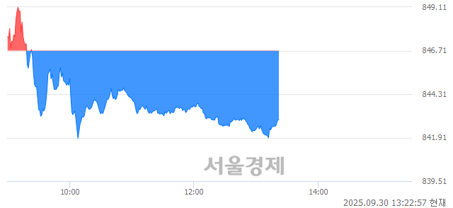 30일 오후 1시 22분 현재 코스닥은 전일 대비 3.88p(-0.46%) 내린 842.83로, 37(매도):63(매수)의 매수우위를 기록 중이다.