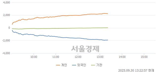 투자자별 동향을 살펴보면, 개인과 기관 동반 매수세를 보이고 있으나, 외국인의 '팔자' 기조에 밀리고 있다. 개인은 2,243억, 기관은 11억을 순매수 중이며, 외국인은 1,943억을 순매도하고 있다.