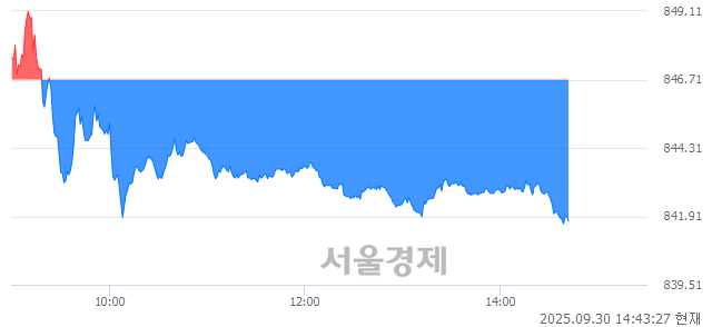 30일 오후 2시 43분 현재 코스닥은 전일 대비 4.93p(-0.58%) 내린 841.78로, 38(매도):62(매수)의 매수우위를 기록 중이다.