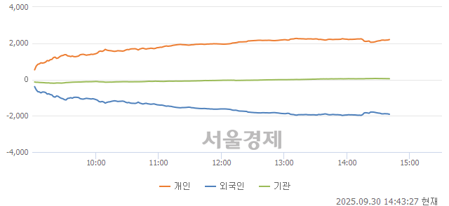 투자자별 동향을 살펴보면, 개인과 기관 동반 매수세를 보이고 있으나, 외국인의 '팔자' 기조에 밀리고 있다. 개인은 2,199억, 기관은 44억을 순매수 중이며, 외국인은 1,910억을 순매도하고 있다.