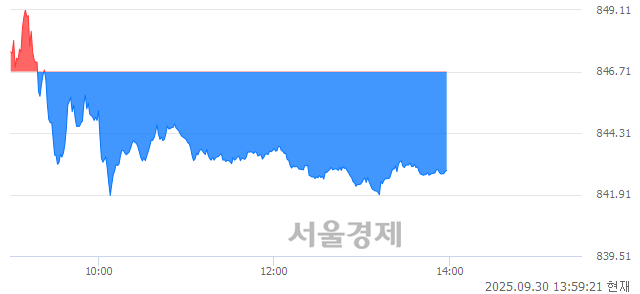 30일 오후 1시 59분 현재 코스닥은 전일 대비 3.93p(-0.46%) 내린 842.78로, 38(매도):62(매수)의 매수우위를 기록 중이다.