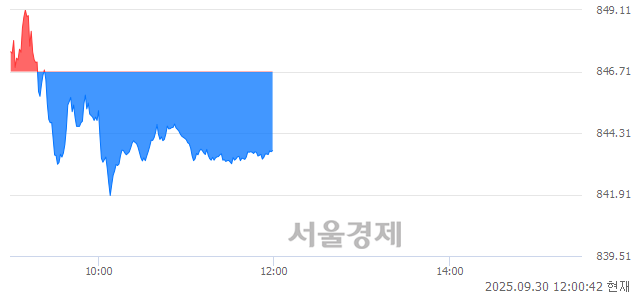 30일 오후 12시 0분 현재 코스닥은 전일 대비 3.08p(-0.36%) 내린 843.63로, 37(매도):63(매수)의 매수우위를 기록 중이다.