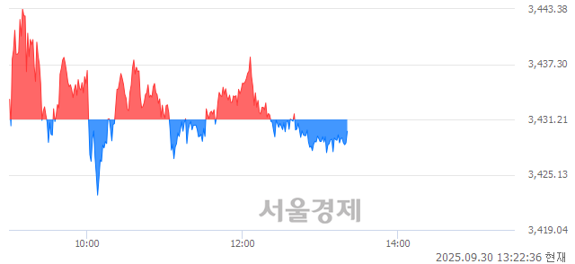 30일 오후 1시 22분 현재 코스피는 전일 대비 2.44p(-0.07%) 내린 3428.77로, 39(매도):61(매수)의 매수우위를 기록 중이다.