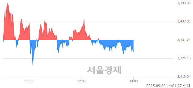 30일 오후 2시 1분 현재 코스피는 전일 대비 3.04p(-0.09%) 내린 3428.17로, 39(매도):61(매수)의 매수우위를 기록 중이다.