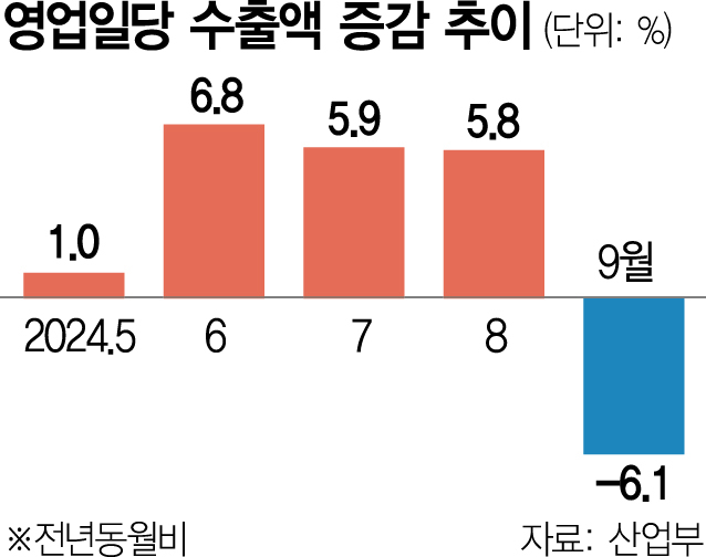 올 9월 일평균 수출액이 전년 대비 6% 넘게 줄어든 것으로 나타났다. 지난해 9월 추석 연휴가 있었던 기저효과 덕분에 총수출은 늘었지만 일일 실적이 감소한 것이다. 반대로 올해 10월은 지난해보다 조업일수가 적어져 수출액이 크게 줄어들 것으로 전망된다.