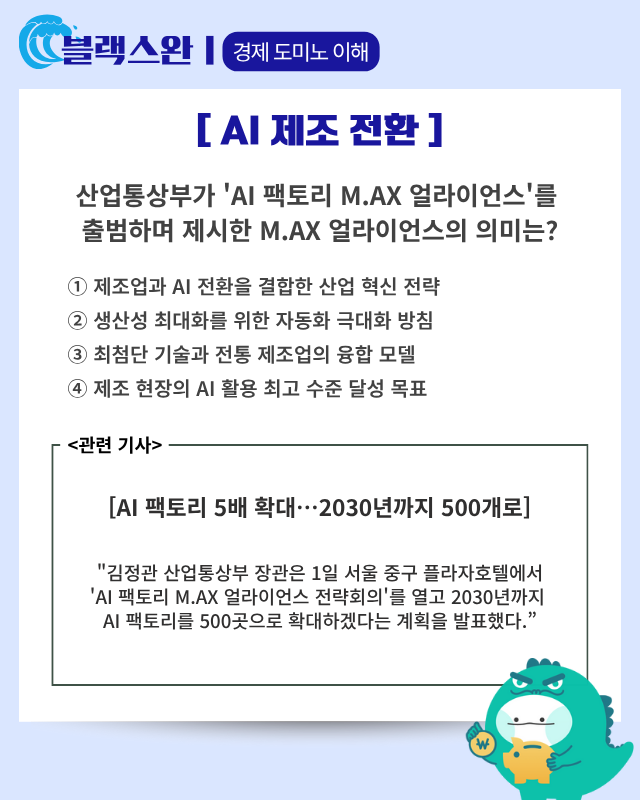 ■ AI 팩토리 확산과 제조업 혁신 가속: 정부가 현재 102개인 AI 팩토리를 2030년까지 500곳으로 확대하며 삼성전자는 HBM 품질 검사 정확도를 99% 이상 높이고 현대차는 생산성을 30% 끌어올리는 성과를 냈다. 신입 직장인들은 피지컬 AI와 휴머노이드 로봇 도입으로 단순 반복 업무가 자동화되는 환경에서 AI 협업 능력과 고부가가치 업무 역량 개발이 필수적이다.