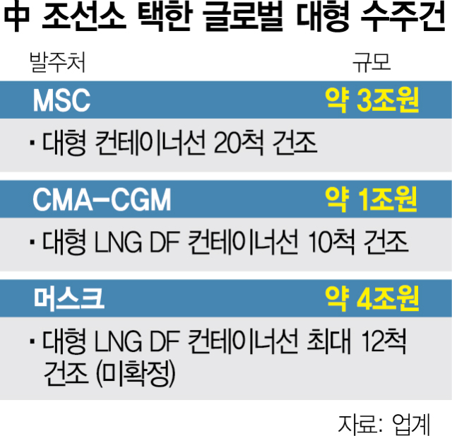 국내 조선 업계는 최근 저렴한 가격을 앞세운 중국 조선사들에 번번이 대형 수주 건을 내주고 있다. 앞선 7월 세계 1위 해운사 스위스 MSC는 중국 조선소 5곳에 컨테이너선 20척 건조를 발주했다. 이어 8월에는 프랑스 CMA-CGM가 약 3조 원 규모의 LNG 이중연료 컨테이너선 10척 건조를 중국 다롄조선중공업에 맡겼다. 두 해운사는 한국과 중국을 저울질하다 결국 가격과 납기에서 앞선 중국을 택한 것으로 알려졌다.