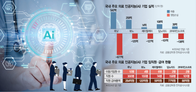 의료 AI 선두기업발 구조조정은 관련 업계 전반으로 확산될 가능성이 높다. 의료 AI 기업 대부분의 재무사정이 루닛과 비슷한 상황이기 때문이다. 뷰노(338220)의 지난해 매출은 259억 원, 영업손실은 125억 원이었다. 임원을 제외한 뷰노 직원들의 연간 급여는 120억 원 수준이다. 지난해 100억 원 이상의 영업손실을 기록한 제이엘케이와 딥노이드(315640), 코어라인소프트(384470) 모두 직원 연간 급여 총액이 영업손실액의 약 50%를 차지했다.