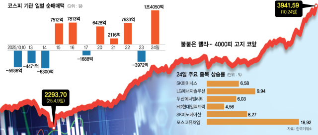 26일 한국거래소에 따르면 24일 코스피는 전 거래일 대비 2.5% 오른 3941.59로 마감했습니다. 장중에는 3950선까지 터치하며 장중·종가 기준 모두 사상 최고치를 새로 썼습니다. 23일 하루를 제외하고 7거래일 연속 사상 최고치 행진입니다.