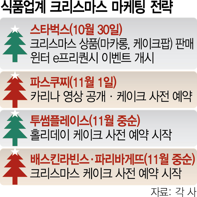 업계에서는 불황일수록 ‘작지만 확실한 행복’을 찾는 소비자 심리를 겨냥해 올해 크리스마스 대목은 예년보다 일찍 달아오를 것으로 보고 있다. 업계 관계자는 “올해도 불황이 이어지다 보니 기업 입장에선 연말 특수에 대한 기대가 크다”며 “매년 크리스마스 사전 예약 일정을 계속 앞당기면서 이젠 ‘누가 더 빨리 크리스마스를 여느냐’가 업계의 최대 관심사가 됐다”고 말했다.