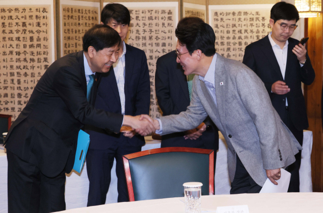 김민석(오른쪽) 국무총리와 구윤철 부총리 겸 기획재정부 장관이 2일 서울 종로구 총리공관에서 열린 제2회 3+α(알파) 회의에 참석해 인사하고 있다. 김 총리 주재로 열린 이날 회의에는 구 부총리와 배경훈 부총리 겸 과학기술정보통신부 장관, 김성환 기후에너지환경부 장관 등이 참석했다. 오승현 기자 2025.11.02