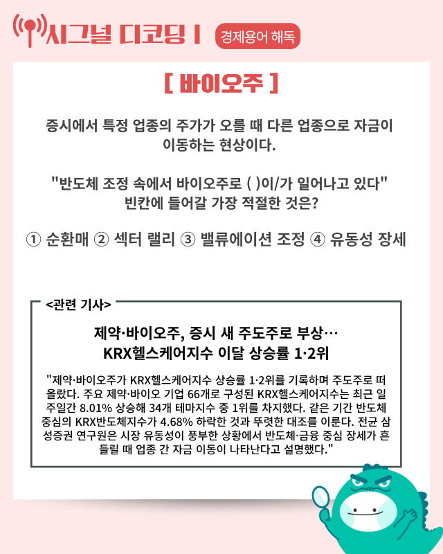 ■ 바이오 순환매: 반도체·조선 등 기존 주도 업종이 조정을 받는 사이 제약·바이오주가 국내 증시의 새로운 주도주로 떠올랐다. KRX헬스케어지수는 최근 일주일간 8.01% 상승해 34개 KRX 테마지수 가운데 상승률 1위를 기록했고, 같은 기간 반도체 중심의 KRX반도체지수가 4.68% 하락한 것과 뚜렷한 대조를 이뤘다.