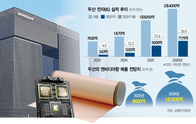 업계에서는 내년 두산의 엔비디아 매출이 1조 원을 넘어설 것으로 보고 있다. 이미 두산은 지난해 4분기 1000억 원을 시작으로 올해 6600억 원의 매출을 엔비디아에서 올릴 것으로 전망되는데 내년에는 이보다 70% 늘어난 1조 1500억 원까지 커질 수 있다는 분석이다.