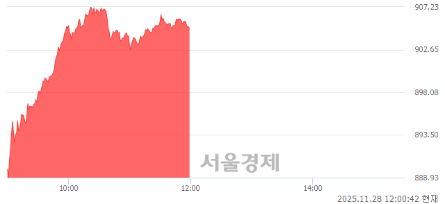 28일 오후 12시 0분 현재 코스닥은 전일 대비 25.13p(+2.86%) 오른 905.19로, 47(매도):53(매수)의 매수우위를 기록 중이다.