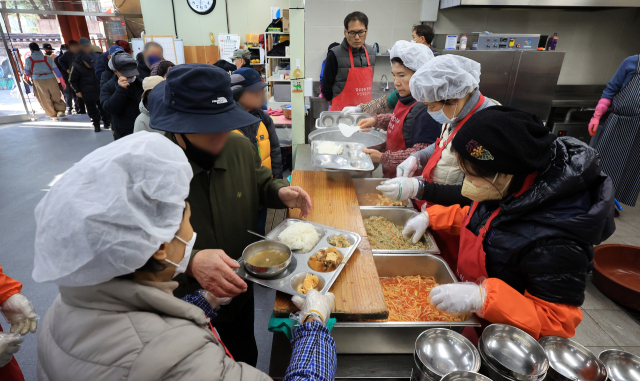 서울 최저기온이 영하 10도까지 떨어진 4일 서울 종로구 탑골공원 원각사 노인 무료급식소를 찾은 어르신들이 무료 배식을 받고 있다. 뉴스1