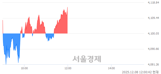8일 오후 12시 0분 현재 코스피는 전일 대비 15.52p(+0.38%) 오른 4115.57로, 43(매도):57(매수)의 매수우위를 기록 중이다.